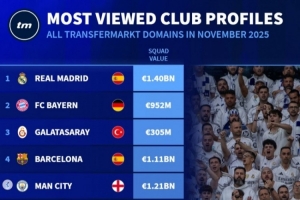 11月德轉(zhuǎn)俱樂部頁面瀏覽量排名:皇馬、拜仁、加拉塔薩雷前三