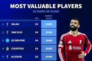 年齡33+球員德轉(zhuǎn)身價榜:薩拉赫4500萬歐居首,梅西第7、C羅第9