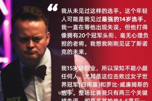墨菲:我從未見過這樣的選手。這個年輕人可能是我見過最強的14歲選手。我一直在等他出現(xiàn)失誤,但他打得像擁有20個冠軍頭銜、毫無心理負擔(dān)的老將。我想我剛剛見證了斯諾克的未來。
