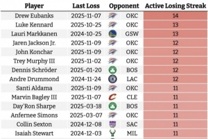 現(xiàn)役球員面對一支球隊的連敗榜,尤班克斯對雷霆14連敗第一,威少對森林狼10連敗,5天后雙方再度交手