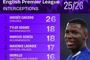 本賽季英超攔截榜: