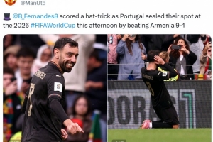 曼聯(lián)官推也曬出B費(fèi)慶祝進(jìn)球照片,配文寫道:“在葡萄牙9-1擊敗亞美尼亞的比賽中B費(fèi)上演帽子戲法,葡萄牙也鎖定世界杯參賽名額?!?/p>