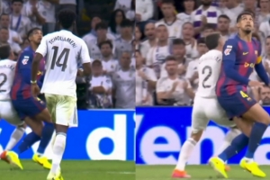 身體層面,皇馬強(qiáng)于巴薩,這在拼搶高空球和身體對抗中體現(xiàn)明顯。米利唐跑動中從巴爾德腳下斷球、巴爾韋德多次與拉什福德一對一較量成功,都是典型的畫面。最糟的是1-2的那次失球:孔德被維尼修斯突破,巴爾德在跳躍爭頂中被貝林厄姆壓制,庫巴西又在另一回合的高空球爭奪中失位,貝林厄姆最終得以輕松射門。德容被赫伊森分散了注意力,放任貝林厄姆完成了完成射門。在1-0的那次進(jìn)攻中,貝林厄姆也輕松擺脫佩德里,一路深入后找到姆巴佩完成射門。