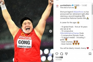 鉛球傳奇鞏立姣在贏得創(chuàng)紀(jì)錄的全運(yùn)會(huì)五連冠后宣布退役??