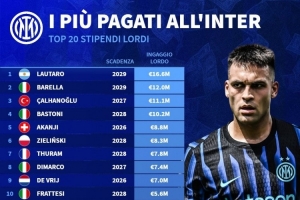 體育資訊11月18日訊 德國轉會市場統(tǒng)計了國米球員的稅前年薪,并列出榜單,勞塔羅1660萬歐居首,巴雷拉、恰爾汗奧盧二三位。