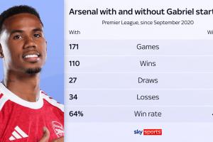 據天空體育統(tǒng)計,阿森納在沒有加布里埃爾的情況下,勝率下跌多達24%。