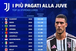 尤文球員稅前年薪排名(括號(hào)內(nèi)為合同期限):