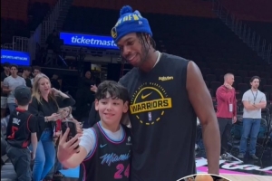 在今天比賽熱身間隙,希爾德看到場邊一位熱火小球迷舉著一個牌子,上面寫著:“生日愿望是可以和希爾德自拍?!毕柕驴吹胶笠埠荛_心的完成了小球迷的生日愿望。