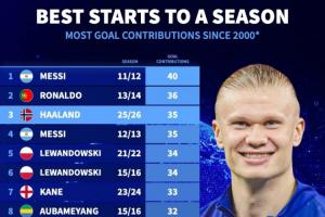 體育資訊11月20日訊 德轉(zhuǎn)統(tǒng)計(jì)了本世紀(jì)賽季開局的進(jìn)球貢獻(xiàn)數(shù),哈蘭德以35粒進(jìn)球位居歷史第三,僅次于梅西和C羅。