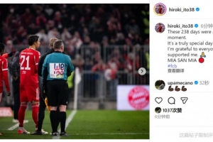 伊藤洋輝賽后在社交媒體上寫(xiě)道:“這238天,都是為了這一刻。 對(duì)我來(lái)說(shuō)這真的是一個(gè)特別的日子。 感謝所有支持過(guò)我的人??MIA SAN MIA??”