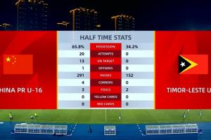 體育資訊11月24日訊 U17亞洲杯預(yù)選賽A組第二輪,中國隊(duì)半場6-0領(lǐng)先東帝汶。數(shù)據(jù)統(tǒng)計(jì)顯示,上半場形勢完全一邊倒。