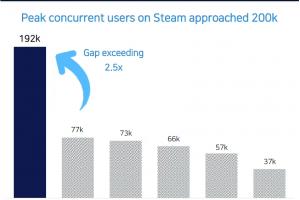 開(kāi)發(fā)商 Shift Up 官方圖表顯示,《劍星》Steam 最高同時(shí)在線(xiàn)玩家數(shù)一度曾達(dá)到 19.2 萬(wàn)人,在曾推出 PC 版本的 PlayStation 獨(dú)占游戲中位列第一。(第二名是《對(duì)馬島之魂》7.7萬(wàn)人)