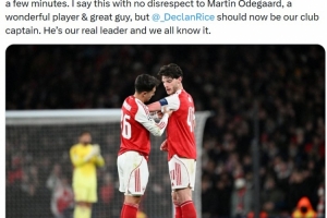 阿森納擁躉摩根在社媒曬出賴斯本場戴上隊(duì)長袖標(biāo)的照片,寫道:“賴斯昨晚比賽中首次戴上阿森納隊(duì)長袖標(biāo),盡管只有幾分鐘。我這么說并不是出于對厄德高的不敬,他也是一名出色的球員、很棒的伙計,但是賴斯現(xiàn)在應(yīng)該成為球隊(duì)隊(duì)長了,他是我們真正的領(lǐng)袖,這我們都知道的?!?/p>