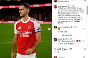 梅里諾寫道:“自豪與榮幸!今晚能有機(jī)會(huì)作為隊(duì)長代表這家俱樂部和這群球員出戰(zhàn),感覺難以置信。感謝所有人的留言和支持,沒有比用一場(chǎng)勝利和晉級(jí)下一輪更好的方式來慶祝了,槍手加油!????????”