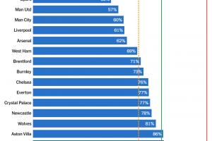 布萊頓以49%的比例表現(xiàn)最佳,財務(wù)狀況最為健康,熱刺和曼聯(lián)緊隨其后。然而,不少俱樂部面臨合規(guī)壓力,維拉、諾丁漢森林等隊已超過歐足聯(lián)設(shè)定的限制線,而伯恩茅斯更是以104%的比例高居榜首,甚至突破了英超聯(lián)賽設(shè)定的“綠色”安全閾值,顯示出較高的財政風險。