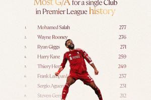 薩拉赫英超單一俱樂部直接參與277球,超魯尼成歷史第一
