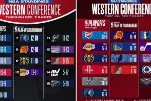去年今天,聯(lián)盟排名如上圖,當時獨行俠西部第二,勇士第五,快船第六,湖人12勝11負第十。