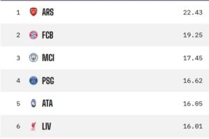 前8名預(yù)測(cè)與目前積分榜前8名沒有太大變化,機(jī)構(gòu)認(rèn)為利物浦最后兩輪將闖入前8,取代國(guó)米直接晉級(jí)。