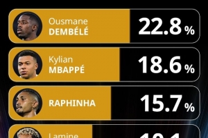 環(huán)足獎最佳球員投票:姆巴佩29.9%領(lǐng)跑,拉菲尼亞、登貝萊前三