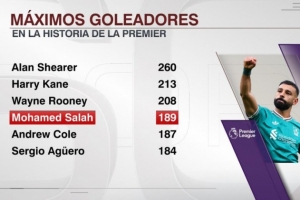 據(jù)ESPN統(tǒng)計,薩拉赫目前在英超打進189球,排名歷史射手榜第四位,差19球追平排名第三的魯尼。