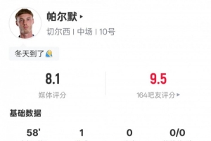 體育資訊12月14日訊 2025-26賽季英超聯(lián)賽第16輪,切爾西主場迎戰(zhàn)埃弗頓。帕爾默首發(fā)出戰(zhàn),1次射門1次射正打進1球,送出2次關鍵傳球,評分8.1。