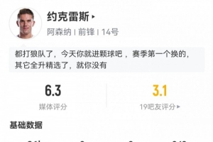 約克雷斯數(shù)據(jù):首發(fā)戰(zhàn)狼隊81分鐘15次觸球1射0正,評分僅6.3