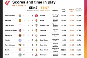 體育資訊12月16日訊 Opta統(tǒng)計(jì)了西甲第16輪的凈比賽時(shí)間,并列出榜單,巴薩vs奧薩蘇納55分33秒排名第5位,阿拉維斯vs皇馬55分18秒排在第6位。