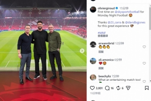 吉魯參與了曼聯(lián)vs伯恩茅斯比賽的解說(shuō)工作,擔(dān)任評(píng)論嘉賓,他在社交媒體上曬出與卡拉格、大衛(wèi)·瓊斯的合照,配文:“首次參加天空體育的周一足球夜節(jié)目,感謝卡拉格和大衛(wèi)·瓊斯讓我擁有這次美妙的體驗(yàn)?!?/p>