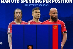 體育資訊12月16日訊 德轉(zhuǎn)盤點了近5個賽季曼聯(lián)在各個位置引援花費情況,其中鋒線引援花費明顯最多,具體如下: