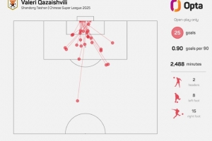 25 – 卡扎伊什維利本賽季在運動戰(zhàn)中攻入25粒進(jìn)球,刷新自有紀(jì)錄以來(2012年),任一球員單賽季中超運動戰(zhàn)進(jìn)球新高。