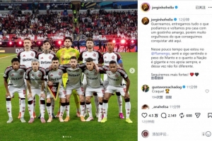 弗拉門戈中場(chǎng)若日尼奧社媒曬出首發(fā)球員的合照,配文:“我們奮力拼搏,傾盡全力,雖然帶著些許遺憾踏上歸途,但仍對(duì)迄今取得的成就感到無比自豪。”