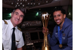 巴黎圣日耳曼球員們帶著獎杯乘坐飛機(jī)返回巴黎,俱樂部官方社媒曬出隊(duì)長馬爾基尼奧斯手拿獎杯與機(jī)長的合照,配文:“前往巴黎!”