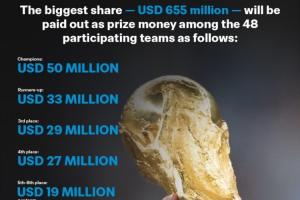 體育資訊12月18日訊 國際足聯(lián)官方昨日公布2026世界杯的獎(jiǎng)金分配方案,獎(jiǎng)金總額7.27億美元,冠軍獎(jiǎng)金5000萬美元,參賽即可拿1050萬美元。