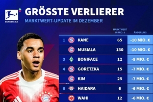 體育資訊12月19日訊 德國轉(zhuǎn)會市場列出了德甲身價下跌榜,凱恩、穆西亞拉身價下降1000萬歐居首。