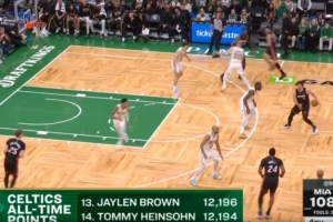 第四節(jié)比賽,杰倫·布朗通過(guò)上籃得到個(gè)人本場(chǎng)第30分,生涯總得分達(dá)到12196分,超越湯米·海因索恩,排名凱爾特人隊(duì)史第13位。