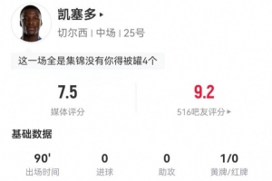 體育資訊12月20日訊 切爾西在本輪英超2-2戰(zhàn)平紐卡,凱塞多本場數(shù)據(jù)如下: