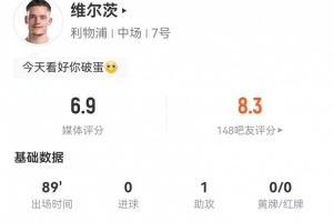 體育資訊12月21日訊 利物浦在本輪英超焦點戰(zhàn)對陣熱刺,維爾茨本場數(shù)據如下: