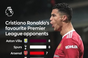 C羅在英超聯(lián)賽中最“偏愛”的對手榜: