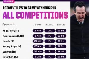 在球隊作為頂級聯(lián)賽俱樂部的111年時間里,維拉首次取得正式比賽10連勝。而且,這也是他們自1990年以來,首次在頂級聯(lián)賽中取得7連勝。