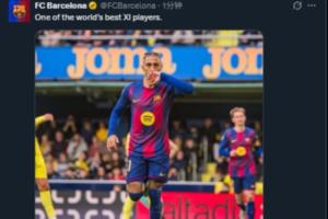 本場比賽后,巴薩官方社媒賬號(hào)曬出了拉菲尼亞的賽場照,并配文:“世界上最好的11個(gè)球員之一。”