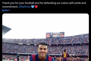巴薩官方寫道:“感謝你帶來的足球,以及感謝你以驕傲和責任心捍衛(wèi)我們的顏色,拉菲尼亞????”