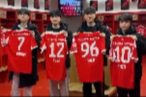 T1分享動(dòng)態(tài):選手們?cè)诎萑手鲌?chǎng)手持球衣合照