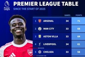 2025年英超總積分榜:槍手34輪71分、曼城33輪68分、維拉33輪64分