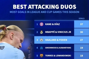 本賽季雙人組進(jìn)球榜:凱恩+迪亞斯37球居首,姆巴佩+維尼修斯次席
