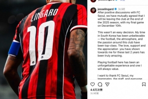 林加德社媒告別首爾FC:很榮幸在這里效力,難忘在韓國(guó)的2年時(shí)光