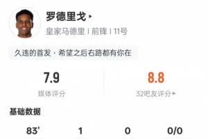 羅德里戈本場數(shù)據(jù):1進球1過人成功+傳球成功率96.7%,評分7.9