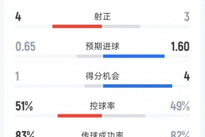 尤文1-0博洛尼亞全場數(shù)據(jù):射門13-12,射正3-4,得分機會4-1