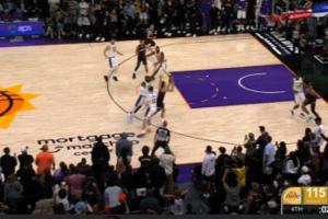 太陽超遠(yuǎn)長傳給阿倫投籃被詹姆斯大帽 斯瑪特?fù)尩交@板并造成犯規(guī)