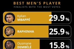 環(huán)足獎最佳球員投票:姆巴佩29.9%領(lǐng)跑,拉菲尼亞、登貝萊前三
