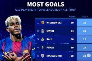 五大聯(lián)賽歷史U19進(jìn)球榜:歐文、勞爾、姆巴佩在列,亞馬爾暫列第9